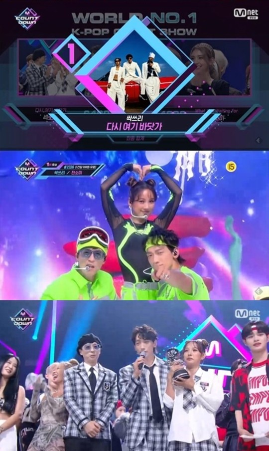 [스타뉴스 여도경 인턴기자] 프로젝트 혼성 그룹 싹쓰리(유재석, 이효리, 비)가 '엠 카운트다운' 정상에 올랐다. 싹쓰리는 30일 오후 방송된 Mnet 음악 프로그램 '엠 카운트다운'에서 신곡 '다시 여�